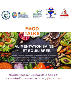 C’est dans l’objectif de promouvoir la santé auprès de nos étudiants et de sensibiliser au bien être que l’Association tunisienne de la recherche scientifique de l’innovation et de l’action pour le développement durable ATRIADD de la FSEGT et le Laboratoire de recherche L.EDDRNA organisent en collaboration avec l’institut National Zouhair Kallel de Nutrition et de Technologie Alimentaire, et ce le vendredi 10 Novembre 2023, 9H 30 -12H30, Stand à la FSEGT